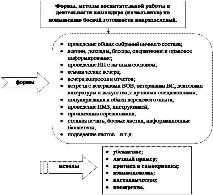 В подготовительный период командиры всех степеней, органы ИР, штабы большое внимание уделяют работе с офицерами, прапорщиками, сержантами, контрактниками от которых в немалой степени зависит успех учений, Главные усилия они в своей работе в этот период сосредотачивают непосредственно в подразделениях. Командирам подразделений, частей оказывается всесторонняя помощь в составлении планов, проведении общих собраний личного состава, осуществляется контроль за качеством учебных занятий и т.д. Тактические учения, как правило, начинаются с подъема подразделений и частей по тревоге. В этот период в основном ИР сосредотачивается на обеспечении быстрого и организованного выхода личного состава из городка (мест постоянной дислокации частей), вывода техники, загрузки и вывоза материально-технических средств в назначенный район, поддержании дисциплины и организованности, бдительности, сохранении военной тайны. Основными формами и методами воспитательной работы по повышения боевой готовности подразделений в деятельности командиров (начальников) являются: Схема №4.