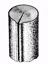 Морозні тріщини являють собою зовнішні поздовжні розриви деревини стовбурів дерев листяних (рідше хвойних) порід, що ростуть, розповсюджуються в глибину стовбура по радіальних напрямках (рис.39). Морозні тріщини утворюються при різкому зниженні температури взимку. На поверхні стовбура ця вада має вигляд довгої відкритої тріщини з гребенями деревини, і кори по краях. Морозні тріщини частіше розташовуються у відземчастій частині стовбура. У круглих лісоматеріалах морозні тріщини добре помітні на бічній поверхні та торцях. У пиломатеріалах виявляються у вигляді довгих радіальних тріщин з розширеними біля них річними шарами. Стінки тріщин темні або засмолені (в хвойних порід). Тріщини усихання виникають у лісоматеріалах під дією внутрішніх напружень при сушці. Тріщини розповсюджуються від бічної поверхні в глибину деревини по радіальних напрямках. Від метикових і морозних тріщин відрізняються малою довжиною (не більше 1 м) і меншою глибиною. Тріщини можуть з'являтися на поверхнях торців круглих лісоматеріалів і пиломатеріалів через нерівномірність висихання їх по довжині. В кінцевій стадії сушки пиломатеріалів крупного перерізу (частіше листяних порід), іноді з'являються внутрішні тріщини (свищі). Залежно від розташування в пиломатеріалах тріщини поділяють на торцьові таі бічні. Тріщини, розташовані на торцях, на бічні сторони пиломатеріалів не виходять (рис.40,а). Бічні тріщини розташовані на бічних сторонах лісоматеріалів і можуть виходити на торці. Серед бічних тріщин в пиломатеріалах розрізняють шарові (рис.40,б) і кромкові (Рис. 40,в).