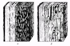 Рис. 43. Ядрова гнилизна: а) строката ситова; б) бура тріщинкувата.