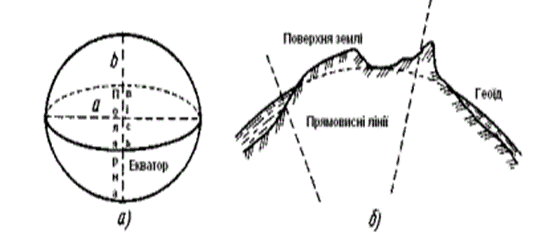 Рис. 1. 1. Земний еліпсоїд (а) і геоїд (б) Лінію, що збігається з направленням сили ваги, називають прямовисною лінією. Якщо рівневу поверхню подумки продовжити під материками, утвориться фігура, яка називається геоїдом (рис. 1, б). Однак, через нерівномірний розподіл мас усередині Землі, поверхня геоїда має складну форму. Тому за математичну фігуру для Землі приймають еліпсоїд обертання, найбільш наближений до геоїда. Земний еліпсоїд відповідним чином подумки розташовують (орієнтують) у тілі Землі. Земний еліпсоїд з певними розмірами й орієнтований певним чином для частини Землі, називають референц-елліпсоїдом. У нашій країні розміри референц-еліпсоїда були отримані під керівництвом видатного геодезиста Ф. М. Красовського. Ці розміри затверджені для використання в роботах по вищій геодезії й картографії. Референц-еліпсоїду привласнене ім'я Красовського. Розміри референц-еліпсоїда Красовського: більша піввісь а = 6378245м, мала піввісь b = 6356863 м, полярний стиск α= а - b/а = 1/298,3. В інженерній геодезії й роботах по топографії умовно вважають, що Земля має форму кулі, обсяг якого дорівнює обсягу земного еліпсоїда, радіус кулі R = 6371,11 км.