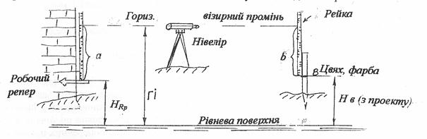 Розглянемо метод перенесення в натуру відмітки точки за допомогою нівеліра і двох рейок. Це виконують від пункту висотної геодезичної основи (репера або марки), закладених на буд майданчику. Порядок роботи: 1) Нівелір встановлюють між репером і об’єктом, на який треба передати відмітку; 2) Беруть відлік по рейці,встановленій на репері – а, в мм; 3) Обчислюють горизонт інструменту ГІ ГІ= НRP+а 4) Обчислюють відлік в по передній рейці, який повинен бути при цьому горизонті на рейці, встановленій на відмітці запроектованої точки. в= ГІ- Нв Нв- відмітка точки,взятої з проекту 5) Піднімаючи або опускаючи рейку, суміщають середню нитку нівеліра з відліком в. П’ятка рейки при цьому співпаде з точкою В, з відміткою Нв, яку фіксують фарбою або цвяхом.