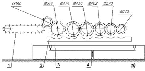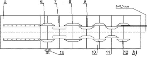 Рис. 4. Технологічна схема машини ПЛ-1, (а) вигляд збоку, (б) вигляд зверху: 1 - кілковий транспортер; 2 - полози; 3 - стіл; 4 - механізм підняття/опускання столу (див. рис. 3.5); 5 - лист столу; 6 - дозатор дискового типу; 7 - пара приймальних дисків; 8-12 - пари потоншувальних дисків (відстань між осями пар 150 мм); 13 - муфта граничного моменту.