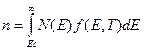 2.Система многих частиц описывается функцией распределения f(E,T), определяющей вероятность того, что уровень с энергией E занят электронами при некоторой температуре Т. Если известна плотность квантовых состояний N(E), то произведение N(E)*dE*f(E)=dn – концентрация носителей заряда, обладающих энергией, заключенной внутри dE (например, концентрация электронов n в интервале от E1 до Е2 будет равна: