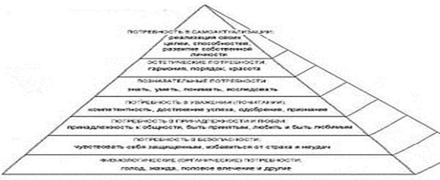 Диаграмма иерархии человеческих потребностей по Абрахаму Маслоу. В системе выделяется семь основных уровней (приоритетов): 1. (низший) Физиологические потребности: голод, жажда, половое влечение и т. д. 2. Потребность в безопасности: чувство уверенности, избавление от страха и неудач. 3. Потребность в принадлежности и любви. 4. Потребность в уважении: достижение успеха, одобрение, признание. 5. Познавательные потребности: знать, уметь, исследовать. 6. Эстетические потребности: гармония, порядок, красота. 7. (высший) Потребность в самоактуализации: реализация своих целей, способностей, развитие собственной личности. Человек при удовлетворении своих потребностей движется, как по лестнице, переходя от низкого уровня к более высокому.