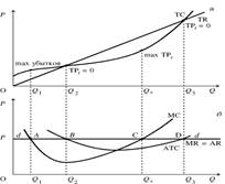 Прежде всего рассмотрим поведение конкурентной фирмы на краткосрочном временном интервале. Вспомним, что в условиях совершенной конкуренции спрос на продукцию фирмы представляет собой прямую линию параллельную оси абсцисс, которая совпадает с линией цены фирмы, а также с предельными затратами (P = AR = MR). Фирма максимизирует свою прибыль при условии, когда (MR = MC). Исходя из графика на рис. 93а, очевидно, что фирма будет стараться увеличить прибыль за счет увеличения разницы между общим доходом и общими затратами путем увеличения TR и уменьшения TC. Введем в график 93б кривые предельных (MC) и средних общих затрат (ATC). Производство каждой дополнительной единицы продукции приносит фирме дополнительные затраты, в то время как предельный доход остается постоянным (MR = P = const). Сначала предельные затраты будут очень высоки и будут превышать предельный доход (Рис. 44 б). Фирма будет терпеть убытки, причем их максимальная величина будет соответствовать такому количеству выпуска Q1, при котором предельные затраты равняются предельному доходу. С дальнейшим увеличением объема производства убытки начнут уменьшаться пока при объеме выпуска Q2 общий доход не сравняется с общими затратами (Рис.4 4а). При данном объеме предельные затраты принимают минимальное значение. (Рис.44б). Затем общий доход превышает общие затраты и фирма начинает получать прибыль.