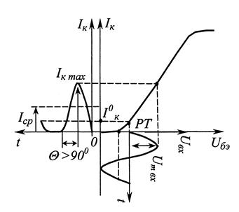 1.2 Режим класса " В " (" АВ ") Режимом класса В называют такой режим работы усилительного каскада, при котором ток в выходной цепи усилительного элемента существует в течение примерно половины периода входного сигнала (рисунок 3). В режиме В рабочая точка усилительного элемента расположена в начале линейного участка ВАХ, для чего во входной цепи изменяют смещение путем уменьшения сопротивления резистора R 2 (рисунок 1). Для полной характеристики данного режима вводят понятие угла отсечки. Углом отсечки Q называют половину периода тока выходного сигнала, выраженного в угловых единицах, в течение которого он протекает через усилительный элемент. В идеальном режиме B угол отсечки Q = 900, а выходной ток протекает в течение полупериода входного сигнала.