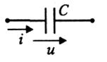 Емкость – идеальный двухполюсный элемент, в котором происходит накопление энергии электрического поля. Введение в теоретическое рассмотрение емкости позволяет описывать процессы, связанные с накоплением электрических зарядов в каком-либо участке цепи, например в конденсаторе. Условно конденсатор можно представить двумя проводящими пластинами (обкладками), разделенными вакуумом или слоем диэлектрика. УГО емкостного элемента представлено на рисунке 3. Накапливаемый в емкости заряд q связан с напряжением и на этом элементе следующим соотношением: q = – Си. В этой формуле q – заряд той обкладки в обозначении емкости, в которую втекает ток проводимости (упирается стрелка опорного направления тока). Другая обкладка имеет такой же заряд, но противоположного знака.