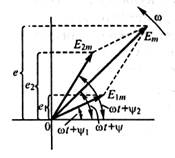 Изобразим ЭДС е 1 и е 2 вращающимися векторами (рисунок 2). Так как проекция на любую ось геометрической суммы двух векторов равна алгебраической сумме их проекций на эту ось, то ЭДС е изображается вращающимся вектором, который равен геометрической сумме векторов, изображающих ЭДС е 1 и е 2.