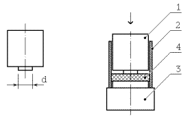 Если результаты испытания в приборе №1 и №2 противоречивы, то для оценки возможности перевозки данного ВМ существует дополнительная методика, которая учитывает возможность распространения взрыва на всю массу ВВ. Сущность метода заключается в определении минимального диаметра ударяющего бойка (d), взрыв под которым вызывает взрыв всей окружающей массы. Схема испытательного прибора приведена на рисунке 6. Испытания проводят на К-44-2 или БК с помощью специальной сборки, позволяющей менять диаметр ударника. Чем меньше диаметр ударника позволяющего распространяться взрыву на всю массу, тем выше чувствительность ВМ.