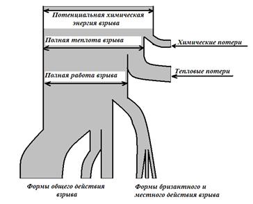 Действие на окружающую среду оказывают газообразные продукты взрыва. Схема баланса энергии при взрыве приведена на рисунке 1. Вся энергия за вычетом химических и тепловых потерь превращается в работу. Избежать химических потерь (за счет неполноты протекания реакций) и тепловых потерь (за счет нагрева окружающей среды) невозможно. Газообразные продукты совершают механическую работу в разных формах (дробление, выброс грунта, образование ударных волн, сейсмических волн и др.), среди них есть полезные формы и бесполезные. Сумма всех работ, произведенных взрывом, называют полной работой. Аполная=А1+А2+А3+Аi+…= η • Е Полная работа обычно составляет 60-70% от полной энергии взрыва. Полезные формы работы составляют обычно не более 10%. Основные формы совершаемой работы подразделяют на две группы: фугасного и бризантного действия. Бризантность (от французского brizer – дробить) – это способность ВВ к местному, т.е. проявляющемуся в непосредственной близости от поверхности заряда, разрушительному действию. Это действие есть результат резкого удара продуктов детонации по окружающей среде (ближние формы работы). Под фугасным действием понимают общее действие взрыва на некотором расстоянии от поверхности ВВ, которое проявляется в совершении работы продуктами взрыва в процессе их расширения до малых давлений. Фугасное действие часто называют работоспособностью.