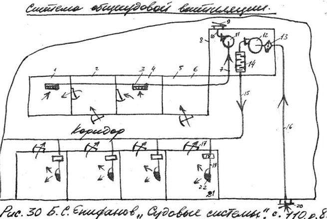 1 – гальюн; 2 – умывальная; 3 – воздухозаборная сетка; 4 – душевая; 5 – раздевальная; 6 – кладовая; 7 – вытяжной воздухопровод; 8 – вентиляторная; 9,20 – водозащитные крышки; 10 – отводной воздухопровод; 11 – вытяжной электровентилятор; 12 – нагнетательный электровентилятор; 13 – воздушный фильтр; 14 – глушитель шума; 15 – приточная магистраль; 16 – приемный воздухопровод; 17 – дверь; 18 – заслонка; 19 – приточные отростки; 21 - каюты; 22 – поворотный воздухораспределитель.