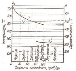 Изменения структуры при разных скоростях охлаждения аустенита. При медленном охлаждении эвтектоидной стали по линии РК (в точке Ar1) произойдет полное распадение аустенита с образованием перлита. Распадение состоит из следующих этапов: 1) превращение g-железа в a-железо, т.е. перегруппировка атомов из решетки гранецентрированного куба g-железа в решетку центрированного куба a-железа с одновременным смещением атомов углерода, находящихся в твердом растворе g-железа; 2) выделение из твердого раствора (аустенита) мельчайших частиц цементита (Fe3C); 3) укрупнение частиц цементита в пластинки, размеры которых измеряются от малых долей микрона до нескольких микронов, и более или менее полный распад аустенита. При ускорении охлаждения до 50 град/сек распад аустенита не успевает закончиться, размеры пластинок цементита достигают лишь десятых долей микрона и различимы только при очень больших увеличениях. Такая структура называется сорбитом (в честь Г.В. Сорби – английского естествоиспытателя). При ускорении охлаждения до 100 град/сек полностью успевает завершиться лишь второй этап распада аустенита, а третий этап останавливается в самом начале. В результате размеры пластинок цементита измеряются стотысячными и миллионными долями миллиметра. Такая структура носит название троостита (по имени Л. Трооста – французского химика). Наличие тончайших пластинок цементита можно обнаружить с помощью электронного микроскопа.