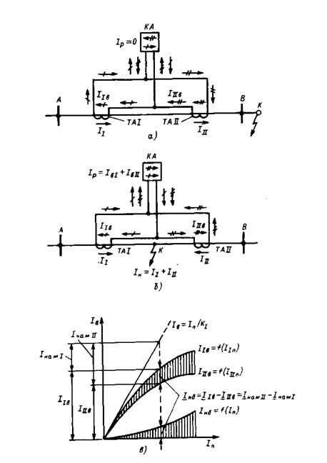 а) Вне защищаемой ЛЭП; б) – на защищаемой ЛЭП; в) – ток небаланса Рисунок 6.1 - Принцип действия дифференциальной РЗ; токораспределение при КЗ: