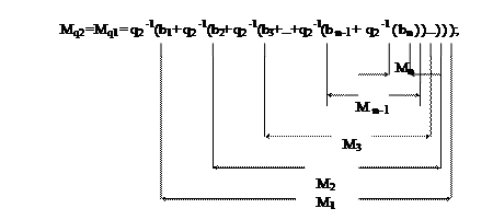 Обозначим выражение в первой скобке как M1, выражение во второй скобке - как M2, выражение в третьей скобке - как M3 и т.д., выражение в (n-1)-й скобке как M n-1, выражение в n-ой скобке как Mn. Число M q1 - правильная дробь, поэтому при умножении M q1* q2 будет получено произведение, в общем случае состоящее из целой части int(M q1* *q2) и дробной части DF (M q1* q2). Использование введенных обозначений позволяет записать: M q1* q2 = (int(M q1* q2) = b1) + (DF(M q1* q2) = M1); аналогично для остальных скобок будем иметь: M1* q2 = (int(M1* q2) =b2) + (DF(M1* q2) = M2); M2* q2 = (int(M2* q2) =b3) + (DF(M2* q2) = M3); M3* q2= (int(M3* q2) =b4) + (DF(M3* q2) = M4); ....................................... Mn-2* q2 = (int(Mn-2* q2) =bn-1)+ (DF(M n-2* q2) = Mn-1); Mn-1* q2 = (int(Mn-1* q2) =bn) + (DF(M n-1* q2) = Mn); M n* q2 = (int(M n* q2) =b n+1) + (DF(M n* q2) = Mn+1).