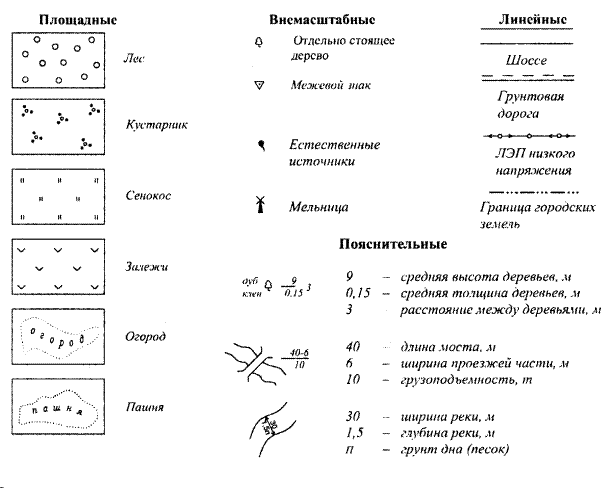 Важнейшим показателем качества топографических карт и планов наряду с точностью является их наглядность. Она достигается применением условных знаков, с помощью которых на картах и планах изображаются ситуация и рельеф местности. Условные знаки, изображающие ситуацию местности, подразделяются на площадные (контурные), внемасштабные, линейные и пояснительные.