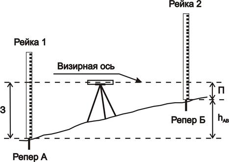 Роль третьей, вспомогательной уровенной поверхности в этом случае выполняет визирная ось нивелира, которая должна быть приведена в строго горизонтальное положение. Если теперь на точках