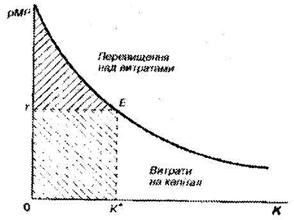 Рис. 2. Оптимальный объем применения капитала МР — предельный продукт, рМР — его стоимость: r — величина заемного процента; К — объем капитала при работе, которая равняется единицы. Для того чтобы определить объем использования того или другого фактора, надо определить цену любого из них. При условиях свободной конкуренции цена на вырабатываемый продукт задается предприятию извне как совокупный результат взаимодействия спроса и предложения. Пока стоимость предельного продукта капитала будет превышать цену дополнительной единицы капитала, предприниматель будет увеличивать применение этого фактора. Это будет длиться до тех пор, пока стоимостный объем предельного продукта не уравняется с ценой капитала. Такой объем применения фактора "капитал" дает предпринимателю максимальный объем превышения дохода над затратами. После того как стоимость предельного продукта и цены капитала уравняются, применение каждой дополнительной единицы капитала приведет к снижению массы дохода, поскольку затраты будут превышать после определенного значения к' дополнительный доход, который будет приносить каждая новая единица капитала (рис. 19). Оптимальный объем производства может равняться затратам на факторы производства, то есть
