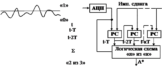 Широкое применение находят схемы цифрового двухпорогового накопления. В устройстве на рис. 5 для этого используется двухуровневое (бинарное) аналого-цифровое преобразование (АЦП), продетектированного напряжения путем временной дискретизации и сравнения с некоторым (первым) пороговым уровнем. Получаемая последовательность нулей и единиц заполняется за несколько периодов посылки k с помощью регистров со сдвигом. Результаты наблюдения для фиксированных дальностей в разных периодах посылки сопоставляется. Логическое устройство «n из k» подсчитывает число единиц i в k
