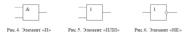 Логический элемент – технический (обычно полупроводниковый) элемент, выполняющий определённую логическую операцию над подаваемыми на его вход цифровыми сигналами. Цифровые сигналы – это сигналы, которые могут принимать только два значения: «0» или «1». Для электрического цифрового сигнала «0» соответствует напряжению 0В и «1» соответствует напряжению +5В. Технические обозначения базовых логических элементов К базовым логическим элементам относятся элементы, выполняющие операции: 1) логического умножения – элемент «И» (рис.4); 2) логического сложения – элемент _________«ИЛИ» (рис.5); 3) инверсии – элемент «НЕ» (рис.6). Входные линии элементов всегда слева, а выходная линия – справа.