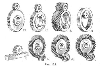 Устройство. Передача вращающего момента от ведущего вала к ведомому в зубчатой передаче (рис. 15.1) осуществляется благодаря давлению зубьев шестерни на зубья колеса. С целью сохранения постоянства передаточного отношения зубья шестерни и колеса должны иметь сопряженные профили. Условие сопряженности зубьев колес обеспечивается, если последние правильно зацепляются с основной рейкой. Контур зубьев основной рейки, зависящий от вида зацепления, называют исходным контуром. Параметры исходного контура выбирают таким образом, чтобы обеспечить максимальную прочность зубьев. Преимущественное распространение в машиностроении получило эвольвентное зацепление. Форма и параметры исходного контура для эвольвентных зубчатых колес (рис. 15.2, а) установлены ГОСТом 13755—68. Профиль контура является прямолинейным на одинаковой длине выше и ниже средней линии а — а, по которой толщина зуба и ширина впадины равны. Боковые стороны зубьев исходного контура наклонены относительно вертикали под углом αд = 20°, называемым профильным углом. Шаг рейки t = π m мм, где т — модуль в мм. По ГОСТу 9563—60 предусмотрены два ряда значений модулей от 0,05 до 100 мм, причем первый ряд следует предпочитать второму. Чаще всего применяют модули: 1; 1,25; 1,5; 2; 2,5; 3; 4; 5; 6; 8; 10; 12; 16; 20; 32; 40 мм.
