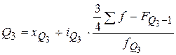 Наряду с медианой для более полной характеристики совокупности применяют и другие значения вариантов, занимающих в ранжированном ряду вполне определенное положение. К ним относят квартили и децили. Квартили делят ряд по сумме частот на 4 равные части, а децили на 10 равных частей. Квартилей насчитывается три, а децилей - девять. Расчёт этих показателей вариационном ряду аналогичен расчёту медианы. Он начинается с нахождения порядкового номера соответствующего варианта и определения по накопленным частотам того интервала, в котором этот вариант находится. Формулы для квартилей в интервальном вариационном ряду имеют следующий вид: нижний (или первый квартиль)