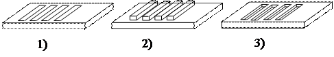 Рисунок 16 - Пример отражающих элементов. 1 - проводящие полоски, 2 – непроводящие полоски, 3 – канавки. Рассмотрим действие распределенного отражателя на модели отражательной решетки, выполненной в виде неоднородной линии передачи ПАВ, характеристическое сопротивление которой периодически скачком изменяется от Z01 до Z02.