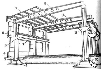 Рис. 2.1б. Фрагмент одноэтажного промышленного здания с каркасом из сборных железобетонных изделий 1 – фундаменты под колонны; 2 – колонны наружного ряда; 3 – подкладка; 4 – фундаментная балка; 5 – стеновые панели; 6 – консоли колонн; 7 – подкрановая балка; 8 – плиты покрытия; 9 – балки покрытия; 10 – внутренние колонны Обратим внимание, на рисунке указаны не только названия основных элементов (цифрами), но и из каких (в скобках) СтМ они изготовлены. Надеюсь, вас поражает многообразие материалов и изделий? Но это ведь далеко не все – ведь они получены по какой-то технологии (которых в СМ более сотни), изготовлены из каких-то материалов (составляющих, компонентов), да и дом (а вариантов домов десятки) является только объектом жилищного строительства, а ведь есть еще промышленное строительство, есть транспорт – железнодорожный и автомобильный, и т.д. Много, сложно? Интригующе? (Хотели интриги - получайте!) Попробуем действовать по принципу – разделяй и властвуй! Скажем иначе (интеллигентней) – классифицируй!