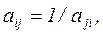 При використанні зазначеної шкали ОПР, порівнюючи два параметри конкурентоспроможності або дві групи параметрів конкурентоспроможності залежно від ступеня їхнього впливу на конкурентоспроможність підприємства, повинна поставити у відповідність цьому порівнянню число в інтервалі від 1 до 9 або зворотне значення чисел. У тих випадках, коли важко розрізнити стільки проміжних градацій від абсолютної до слабкої переваги або цього не потрібно в конкретному завданні, може використатися шкала з меншим числом градацій. У крайньому випадку шкала має дві оцінки: 1 — об'єкти рівнозначні; 2 — перевага одного об'єкта над іншим. Після побудови ієрархії встановлюється метод порівняння її елементів. Якщо приймається метод попарного порівняння, то будується множина матриць парних порівнянь. Для цього в ієрархії виділяють елементи двох типів: елементи-"батьки" і елементи-"нащадки". Елементи-"нащадки" впливають на відповідні елементи вищого рівня ієрархії, що є стосовно перших елементами-"батьками". Наприклад, група "конкурентні переваги об'єкта управління" — елемент-"батько", а вхідні в неї конкурентні переваги (параметри конкурентоспроможності) — елементи-"нащадки". Матриці парних порівнянь будуються для всіх елементів-"нащадків", що відносяться до відповідного елемента-"батька". Потім будуються матриці попарних порівнянь для елементів-"батьків" одного ієрархічного рівня. Парні порівняння проводяться в термінах домінування одного елемента над іншим. Заповнення квадратних матриць парних порівнянь здійснюється за наступним правилом. Якщо елемент Для одержання кожної матриці експерт або ОПР виносить Розглянемо в загальному вигляді приклад формування матриці парних порівнянь. Нехай Матриця парних порівнянь має властивість зворотної симетрії, тобто