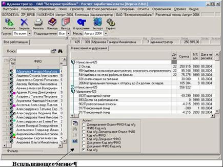 В графах «Всего дней» и «Всего часов» всегда отображается полная информация об отработанном времени работника за текущий месяц, независимо от того на каком дне установлен курсор. В графе «Продолжительность дня» отображается информация о дне, на котором установлен курсор. Нижняя таблица экрана предназначена для ввода сверхурочных, ночных и часов работы во вредных условиях. Для этого необходимо в нижней таблице экрана в графе «Продолжительность дня» указать необходимое количество часов в соответствующей строке. При включении опции «отображать периоды» в нижней части экрана появляется область для внесения не планируемых ранее нерабочих дней, например по болезни (больничный лист не сдан). После завершения редактирования табеля табельщик должен подтвердить окончание редактирования табеля путем нажатия кнопки «Подтвердить», после этого редактирование для него будет невозможно, а только доступен режим просмотра. По окончании месяца табель закрывают: в нем подсчитывают по каждому работнику количество дней явок на работу, количество отработанных часов, в том числе праздничных, сверхурочных и т.д. Табель подписывает руководитель структурного подразделения и после утверждения руководителем банка передает в бухгалтерию. Для расчета аванса его могут представлять в бухгалтерию два раза в месяц: отдельно за первую и вторую половину месяца. Данные табелей по учету использования рабочего времени применяются при составлении текущей статистической отчетности по труду, для контроля и анализа трудовой дисциплины в банке, для расчетов с рабочими и служащими по оплате труда. При повременной форме они являются единственным основанием для начисления заработной платы. Заработная плата работников банка состоит из: · тарифной части, зависящей от квалификации работника, ложности выполняемой работы и отработанного времени – должностного оклада (ставки); · индивидуальных выплат стимулирующего и компенсирующего характера – надбавки за высокие достижения в труде и высокую квалификацию, профессиональное мастерство, надбавки за стаж работы в банках, доплаты за совмещение профессий, расширение зоны обслуживания и выполнение обязанностей временно отсутствующего работника, доплаты за работу в ночное время или в ночную смену при сменном режиме работы, других надбавок и доплат; · выплат, зависящих от конечных результатов работы банка и личного вклада работника в общие результаты труда, – премии за основные результаты хозяйственной деятельности, других видов премий; специальных вознаграждений, вознаграждений по итогам работы за год; · прочих выплат, предусмотренных законодательством и Положением об оплате труда работников. В сумму начисленной заработной платы работникам банка включаются ежемесячные надбавки, доплаты и выплаты: К ежемесячным надбавкам в банках относятся следующие надбавки: · за высокие достижения в труде и высокую квалификацию; · за профессиональное мастерство; · за стаж работы в банках; · за владение иностранными языками; · за классность; · за безаварийность и качественное обслуживание автомобиля (водителям автомобилей); · за особенности труда. К доплатам в банках относятся следующие виды начислений: · за совмещение профессий (должностей); · за расширение зоны обслуживания (увеличение объема выполняемых работ);