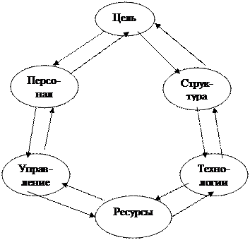 Рисунок 1.2 – Схема основных элементов организации В контексте управления персоналом основные элементы организации имеют следующее значение: - цель – это то, для чего существует организация; - структура – это характеристика взаимосвязей между элементами организации; - технология – это часть производственного процесса, состоящая из совокупности взаимосвязанных операций, направленных на изменение или контроль состояния продукта труда; - персонал – это часть человеческих ресурсов, объединенная материальными средствами и целями деятельности одной организации; - управление – это профессиональная деятельность людей, направленная на координацию действий персонала организации в соответствии с целями ее деятельности. - ресурсы – это все то, что обеспечивает достижение цели организации (в том числе и человеческие ресурсы);