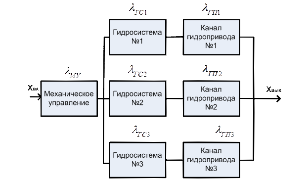 Рис.7.3.4. Логическая схема для приближённой оценки интенсивности отказов резервированной системы из трёх рулевых приводов с механическим управлением. Здесь: λГС1,…3; λгп1,…3 – интенсивности отказов соответственно гидравоических систем питания и рулевых приводов с механическим управлением. Приближённая оценка эквивалентной интенсивности отказов трёхканальной системы гидропитания и трёхканального привода без учёта резервированной механической проводки управления составляет величину: