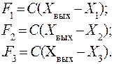 Рис.7.3.5 Общая схема резервированного привода с суммированием сил на общем выходном звене – траверсе: 1 – общее выходное звено; 2 – упругость крепления штока подканала к общему выходному звену с жёсткостью Сi; Х1, Х2, Х3 – перемещение штоков резервных подканалов привода; Хвх1, Хвх2, Хвх3 – входные сигналы.