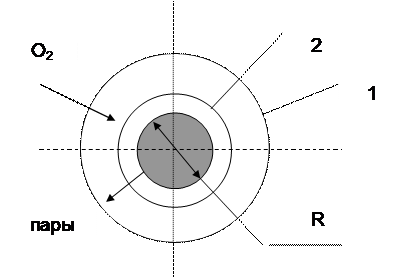 Капля жидкости, попав в реакционное пространство техногенного устройства с повышенной температурой, нагревается и испаряется. Схема горения имеет вид (рис) Пары смешиваются с воздухом и воспламеняются на границе 1. Фронт горения перемещается ближе к капле и занимает положение 2, определяемое недостатком кислорода О2. Затем положение фронта стабилизируется, скорость горения уравновешивается скоростью испарения.