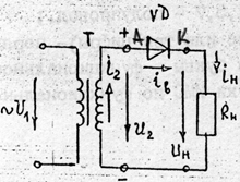 При положительном потенциале на аноде VD открыт, протекает ток iв, при обратной полярности напряжения U 2 диод VD закрыт, ток iв = 0. Ток и напряжение нагрузки i н, U н – пульсирующие (выпрямленные) Среднее значение выпрямленного напряжения: U н.ср .