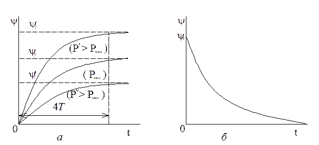 Конечное значение τ = τуст не зависят от τнач, а только от р и А. Температуру двигателя можно считать установившейся при t = 4 Т. Постоянная времени нагрева – важный параметр, так как характеризует скорость протекания тепловых процессов. Чем больше Т, тем медленнее происходит нагрев. Значение Т зависит от мощности, частоты вращения, исполнения двигателя и изменяется от 10÷15 мин для двигателей малой мощности до 4÷5 ч для двигателей большой мощности. Величина Т больше у закрытых двигателей. При отключение двигателя от сети происходит его охлаждение и р = 0 (рис. б).