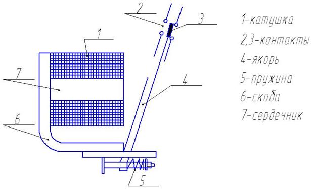 Максимальное токовое реле применяют для защиты двигателей от токов короткого замыкания. Катушку 1 реле включают последовательно с защищаемой цепью, поэтому в ней протекает рабочий ток электроустановки. Катушку реле выполняют из небольшого числа витков толстого провода, чтобы ее сопротивление было малым. Создаваемый током магнитный поток замыкается по сердечнику 7, скобе 6 и якорю 4. при протекании по катушке тока, равному номинальному или несколько превышающего его, якорь 4 удерживается в положении, указанном на рисунке, пружиной 5. Если ток в цепи превысит номинальное значение в несколько раз, что имеет место при коротком замыкании, то возникающая магнитная сила станет столь велика, что якорь 4 притянется к сердечнику 7, преодолевая силу пружины 5. При этом контакт 3 разомкнется, а контакт 2 замкнется. Контакты 3 реле включают в цепь управления контактора или другого аппарата, поэтому при их размыкании контактор отключает двигатель. Ток срабатывания максимального токового реле регулируется натяжением пружины 5. Обычно выбирают ток срабатывания I сраб = (2…3) I ном