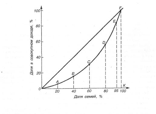 . Кривая Лоренца Форма кривой Лоренца характеризует степень неравномерности распределения доходов. Чем круче изгиб кривой и чем дальше она отстоит от кривой абсолютного равенства, тем больше неравенство в распределении доходов, и наоборот. Кривая Лоренца, характеризуя величину денежных доходов у различных групп населения, позволяет прогнозировать изменение благосостояния людей, их покупательную способность и, следовательно, спрос. А это позволяет принимать необходимые меры по регулированию и поддержанию равновесного ЧНП.