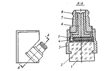 Рис. 2.4. Схема наклонного совмещенного преобразователя типа ИЦ: 1 — призма; 2 — пьезоэлемент; 3 — корпус излучателя; 4 — изоляционное кольцо; 5 — демпфер; 6 — контактный штырь; 7 — изоляционная втулка; 8 — зажимная гайка.