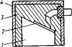 Рис. 2.5. Схема наклонного совмещенного преобразователя типа «Снежинка»: 1 — призма; 2 — пьезопластина; 3 — демпфер; 4 — корпус. В комплекте преобразователей КГН-1 имеются ПЭП с углами наклона призм 30, 40, 50, 53 и 55°. Миниатюрные преобразователи «Снежинка» (рис. 2.5). Эти преобразователи выпускаются с углами призм 30, 40 и 50° на частоту 5 МГц. Призмы преобразователей изготавливают из поликарбоната дифлок — материала с высокой теплостойкостью, морозостойкостью и низким водопоглощением. Стабильность свойств поликарбоната сохраняется в диапазоне температур от -100 до +100°С. Затухание в нем УЗ-колебаний примерно в 3—4 раза выше, чем в плексигласе, что обеспечивает уменьшение реверберационных помех. Износостойкость поликарбоната в 3 раза выше износостойкости оргстекла. Пьезоэлементы данных преобразователей имеют прямоугольную форму. Демпфирующий материал в преобразователях «Снежинка» аналогичен материалу в КГН-1. По чувствительности преобразователи этого типа также уступают преобразователям типа ИЦ. Данные преобразователи наиболее целесообразно применять для контроля качества сварных швов тонкостенных конструкций с обработанной поверхностью, а также в труднодоступных местах. В современных дефектоскопах используются различные комплекты преобразователей: «Приз-3», «Приз-4», «Приз-5». Низкочастотные контактные прямые совмещенные преобразователи «Приз-3» предназначены для контроля качества неметаллических изделий, в том числе и строительных, а также для измерения их физико-механических свойств. Преобразователи комплекта «Приз-4» служат для контроля качества толстостенных изделий, листового проката и изделий с грубообработанными поверхностями. Комплект «Приз-5» предназначен для контроля качества сварных швов изделий из аустенитных сталей. Из преобразователей, выпускающихся за рубежом, наибольшее применение нашли преобразователи фирмы «Крауткремер». Пьезоэлемент квадратной формы, изготовленный из кварца, приклеивается к призме. Для гашения шумов в преобразователе к призме в свою очередь приклеивается ловушка из звукопоглощающего материала. Отличительной особенностью данных преобразователей является высокая чувствительность, износостойкость и хорошая смачиваемость. В связи с тем что в наклонных преобразователях фирмы «Крауткремер» отсутствует демпфер, они имеют большую величину мертвой зоны и более низкую разрешающую способность по сравнению с отечественными преобразователями. Стрела этих преобразователей значительно больше стрелы отечественных преобразователей, что не позволяет производить контроль прямым лучом нижней части шва тонкостенных сварных изделий. На преобразователях фирмы «Крауткремер» обозначаются углы ввода УЗ-колебаний по стали, которые составляют 35; 45; 60; 70 и 80°.