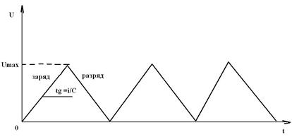 Напряжение на конденсаторе будет линейно меняться во времени с тангенсом угла наклона, равным I/C. Чередуя заряд – разряд, получим пилообразное изменение напряжения, как на этом рисунке.