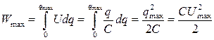 То есть форма разрядной и зарядной кривых конденсатора отличается от ХИТ (аккумулятора). Это определено принципиальной причиной. Заряд и разряд аккумулятора обусловлен электрохимической реакцией, которая протекает при приблизительно постоянном напряжении (при приблизительно постоянном потенциале). Заряд же и разряд конденсатора обусловлены накоплением электростатической энергии в соответствии с формулами, приведенными выше. По этой же причине скорость заряда и разряда конденсатора может на многие порядки превышать соответствующие скорости для аккумулятора, которые резко ограничены скоростью химических и фазовых превращений электродных веществ. Максимальная энергия, накапливаемая конденсатором, вычисляется по формуле: