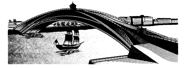 Рис.2. Деревянный мост арочной системы через р. Неву по проекту Строительство деревянных низководных мостов получило крупный размах во время Великой Отечественной войны. Эти мосты по протяженности составляли до 85 % всех возводившихся мостов. На реках Днепр, Неман, Днестр, Висла и Одер войска строили и высоководные мосты с использованием новых типов упрощенных конструкций дощато-гвоздевых ферм с пролетами до 30 м. Применяли также пролетные строения с ригельно-раскосными фермами из бревен пролетами до 30 м, а также деревянные комбинированные полетные строения с ездою понизу с пролетами до 50 м. В конце войны низководные мосты на свайных опорах строили с темпом 4... 6 м/ч, а высоководные с темпом 25... 30 м в день. Во второй половине ХХ в. в России при строительстве новых мостов все большее распространение стал получать железобетон. В настоящее время деревянные мосты на федеральных автомобильных дорогах не строят. Они находят применение лишь как временные мосты — подмости при строительстве капитальных железобетонных или металлических мостов. Тем не менее, нельзя считать, что деревянные мосты исчерпали себя. Они могут еще найти применение на местных дорогах в районах, богатых лесом, при условии применения более совершенных конструктивных форм, рассчитанных на индустриальные методы изготовления и возведения, при условии оснащения мостостроительных организаций специальными мостостроительными средствами. В России есть также предпосылки для более широкого применения клееных и клеефанерных конструкций в мостостроении. Еще в середине прошлого века в России коллективом ученых и инженеров во главе с профессором Г. Г. Карлсеном была предложена эффективная технология деревянных клееных конструкций. С учетом этой технологии были разработаны проекты типовых балочных пролетных строений с клееными несущими элементами и были построены несколько мостов. Опыт их эксплуатации показал их высокую конкурентную способность по сравнению с железобетонными мостами. Однако после развала СССР в 1990-е годы по разным причинам изготовление клееных мостовых конструкций в России, к сожалению, прекратилось. Другим естественным материалом для мостостроения является камень. Мосты из камня строили, в основном, в горной местности и они служили веками. Недостатком при возведении каменных мостов является большая трудоемкость. Так как механизировать процессы по обработке камня и устройству каменной кладки в достаточной мере не удается, что и обусловило ограниченное применение каменных мостов в современных условиях. Практически в настоящее время их не возводят, за исключением единичных сооружений малых пролетов в горной местности. Железобетонные мосты появились в практике строительства во второй половине IX века и в настоящее время имеют преимущественное распространение на автомобильных дорогах и в городах. Железобетон применяется также для устройства труб, малых и средних мостов, а также для мостов больших пролетов. В 1892 г. француз Геннебик предложил систему армирования, состоящую из продольных стержней с поперечными хомутами. Она обеспечила переход к современным железобетонным сооружениям. По его предложению появились и ребристые мостовые конструкции, что способствовало в дальнейшем развитию арочных и балочных систем железобетонных мостов. За 