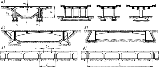 Рис.25. Виды монолитных рамных мостов Монолитные рамные мосты могут быть однопролетными и многопролетными. В однопролетных мостах (см. рис.25, а) часто применяют двухконсольные рамы. Консоли разгружают главные балки, уменьшают изгибающие моменты в стойках и позволяют осуществить простое сопряжение моста с насыпью. Если по местным условиям нельзя оставлять открытыми конусы насыпей, то рама может быть выполнена с ребристыми опорами, имеющими откосные крылья. В зависимости от качества грунтов такие рамы могут иметь шарнирное (рис.25, б) или жесткое (рис.25, в) закрепление. Жесткое (бесшарнирное) закрепление обеспечивается грунтом, заполняющим коробчатый устой. Многопролетные рамные мосты, путепроводы и эстакады устраивают с учетом температурных деформаций сооружения. При длинных мостах в них возникают большие напряжения из-за деформаций при изменении окружающей температуры. Поэтому многопролетные рамы разбивают на части длиной не более 50-70 м, деформирующиеся независимо одна от другой. Такое разделение можно обеспечить устройством балочного подвесного пролетного строения между рамами (рис.25, г) длиной Комбинированная система – образуется из основных систем: арочно-балочная внешне распорная (однопролетная и многопролетная); висячая с балкой жесткости; вантовая с балкой жесткости; рамно-балочная.