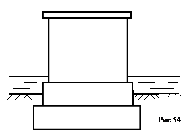 Грунт, имеющий недостаточную прочность и высокую сжимаемость, в основании сооружения может быть заменен песчаной или гравийной подушкой. Есть еще способ поверхностного уплотнения грунтов. Уплотнение глинистых грунтов на глубину до 40-45см может быть произведено с помощью катков различных систем, виброплит или способом трамбования. При силикатизации в качестве основного вяжущего используется натриевое жидкое стекло, которое затвердевая цементирует грунтовые частицы превращая закрепляемый грунт в прочный и водонепроницаемый массив. Следующий способ – закрепление сухих и водонасыщенных песчаных грунтов с помощью карбамидной смолы. В результате взаимодействия раствора карбамидной смолы и соляной кислоты образуется гель, который связывает частицы песка в прочный монолит. Цементацию применяют в скальных трещиноватых породах с целью уменьшения их водонепроницаемости и укрепления. Цементный раствор заполняет трещины и пустоты в скале, что придает монолитность породе. Существуют также методы глинизации, битумизации грунтов, укрепление глинистых грунтов с помощью электротока (электроосушение), обжиг грунтов, искусственное замораживание грунтов. Вопросы для самоконтроля: 1. Что такое основание, и какими они бывают? 2. Виды грунтов в основании транспортных сооружений. 3. Способы укрепления грунтов. Для передачи давления от сооружения на грунт устраивают фундамент, являющийся опорным элементом сооружения, распределяющим его давление на грунт. Нижняя плоскость, которой фундамент, опирается на грунт, называется подошвой. Верхняя граница между фундаментом и телом сооружения (опора) называется плоскостью обреза или просто обрезом фундамента. К фундаментам мелкого заложения относятся фундаменты с глубиной заложения 4-6м. Фундаменты мелкого заложения возводятся в котлованах, предварительно отрытых на полную глубину с поверхности грунта. Подобный метод производства работ при небольших глубинах заложения фундаментов является наиболее выгодным. Другая отличительная особенность фундаментов мелкого заложения заключается в том, что при расчете их перемещений и определении напряжений в основании не учитывается сопротивление грунта по боковой поверхности фундаментов. По конструкции фундаменты мелкого заложения имеют следующие разновидности: а) Массивные фундаменты (Рис.54) – представляют собой призму, несущую сверху сооружение (опору моста), опирающуюся нижней плоскостью (подошвой) на грунт. Для увеличения площади опирания их часто уширяют книзу уступами (рис. 57).