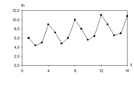 Число периодов, по которым рассчитывается коэффициент автокорреляции, называют лагом. С увеличением лага число пар значений, по которым рассчитывается коэффициент автокорреляции, уменьшается. Для обеспечения статистической достоверности максимальный лаг, как считают некоторые известные эконометристы, не должен превышать четверти общего объема выборки. Коэффициент автокорреляции строится по аналогии с линейным коэффициентом корреляции, и поэтому он характеризует тесноту только линейной связи текущего и предыдущего уровней ряда. По нему можно судить о наличии линейной или близкой к линейной тенденции. Однако для некоторых временных рядов с сильной нелинейной тенденцией (например, параболической или экспоненциальной), коэффициент автокорреляции уровней ряда может приближаться к нулю. Кроме того, по знаку коэффициента автокорреляции нельзя делать вывод о возрастающей или убывающей тенденции в уровнях ряда. Большинство временных рядов экономических данных имеют положительную автокорреляцию уровней, однако при этом не исключается убывающая тенденция. Последовательность коэффициентов автокорреляции уровней различных порядков, начиная с первого, называется автокорреляционной функцией временного ряда. График зависимости ее значений от величины лага называется коррелограммой. Анализ автокорреляционной функции и коррелограммы помогает выявить структуру ряда. Здесь уместно привести следующие качественные рассуждения. Если наиболее высоким является коэффициент автокорреляции первого порядка, очевидно, исследуемый ряд содержит только тенденцию. Если наиболее высоким оказался коэффициент автокорреляции порядка τ, Пример 1. Пусть имеются данные об объёмах потребления электроэнергии жителями района за 16 кварталов, млн. квт.-ч: