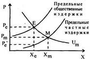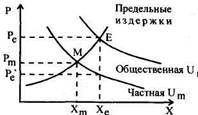 Отсюда с очевидностью следует, что каждый индивид уравнивает с ценами свое личное MRS между двумя благами: Следовательно, рынок не позволяет интернализировать внешние эффекты и тем самым достигнуть оптимума. В уже рассмотренном примере это означает, что: - 1) потребитель 2 согласится в условиях рынка (в нескоординиро- - 2) относительное потребление блага 1 сравнительно с благом 2 бу Если MRS соответствуют предельным полезностям в денежном выражении (и предельным значениям готовности платить за благо), то в случае положительного (соответственно - отрицательного) внешнего эффекта, величина предельной частной полезности индивида, ответственного это воздействие, ниже (соотв. - выше) предельной общественной полезности (т.е., суммы предельных величин полезности всех индивидов в этом обществе, выраженных в денежной форме). Рынок приводит к уравниванию частной полезности Um и цены, тогда как оптимум предполагает уравнивание общественной Um и цены. С другой стороны, если предприятие ответственно за положительный (отрицательный) эффект для других предприятий или для потребителей, его предельные частные издержки будут выше (соотв. — ниже), чем предельные общественные издержки (издержки, в которые входит вся совокупность эффектов от его деятельности на других членов общества). На рис. 11 представлены некоторые из возможных случаев. В случае а) отрицательный внешний эффект заставляет рынок уравнивать частную Um, цену и Ст в точке М, тогда как оптимум предполагает, что уравнива- Г»1 ются общественная Um, цена и Ст в точке Е. Налог со ставкой р'е—ре за единицу блага позволит восстановить равновесие в точке Е (потребители платят сумму р'е, равную их предельной частной полезности, и предъявляют спрос на Х„ тогда как производители производят лишь X,, так как получают цену, равную лишь ре). Отметим, что этот налог, называемый налогом Пигу (по имени А. Пигу - автора, его предложившего), не имеет целью ни пополнять государственные фонды, ни покрывать ущерб тех, кто пострадал от отрицательных внешних эффектов. Этот налог носит исключительно побудительный характер: цель его — отделить цену, заплаченную потребителями, от цены, полученной производителями, и способствовать такому равновесию на рынке, чтобы количество блага, участвующего в обмене, соответствовало оптимуму. Случай Ь) симметричен предыдущему: здесь внешний эффект положителен, и субсидия в размере ре—р'е позволит добиться рыночного равновесия, которое соответствует оптимуму. Случай с) соответствует отрицательному внешнему эффекту, спровоцированному предприятием (например, загрязнение окружающей cре-1 ды). Предельные общественные издержки выше, чем предельные частные издержки. Напротив, поскольку никакого внешнего воздействия не предполагается, когда речь идет о потребителях, между предельной частной полезностью и предельной общественной полезностью разницы не существует. Оптимум предполагает уравнивание предельных общественных издержек и предельной полезности, тогда как рынок уравнивает предельные общественные издержки, цену и предельную полезность. И здесь налог со ставкой р'е - ре за единицу блага позволяет вернуться к оптимуму. В случае d, симметричном случаю с, потребуется субсидия в сумме ре-р'е> одинаковой для всех. Субсидии в бюджетном процессе занимают очень важное место, так как со