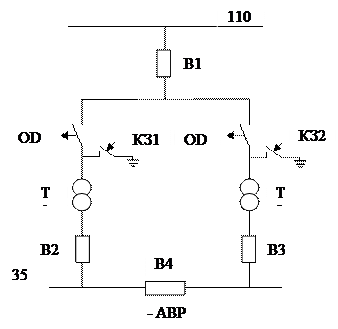 Отделители ОД1 и ОД2 при нормальном режиме работы замкнуты. При аварийной ситуации (утечка масла на Т-1) по сигналу релейной защиты включается короткозамыкатель КЗ1 и в цепи возникает искусственное КЗ. Под действием тока КЗ отключается выключатель В1 и оба трансформатора Т1 и Т2 – обесточиваются. По сигналу релейной защиты трансформатора Т1 отключается выключатель В2,и с некоторой выдержкой времени отключается отделитель ОД1 (Отключен и отсоединен от основной сети трансформатор Т1). Затем, так как режим искусственного КЗ отключен, снова включается выключатель В1. Если до аварии выключатель В4 был отключен, то после включения В1 включается выключатель В4, восстановлено питание потребителей на линиях 35 кВ не только от трансформатора Т2, но и трансформатора Т1.