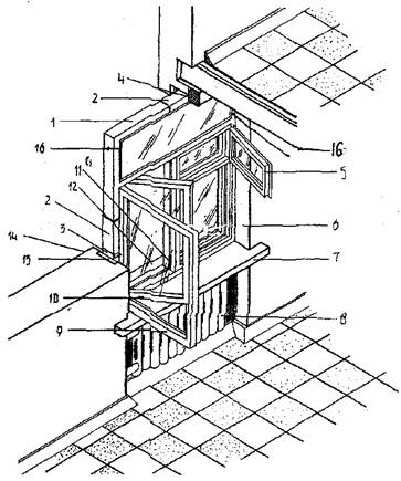 1-оконная коробка» 2 – гидроизоляция; 3 – конопатка; 4 – ж.б. перемычка; 5 – форточка; 6 – оконный откос; 7 – подоконная доска; 8 – ниша подоконно отопительного прибора; 9 – створка подоконного переплета; 10 – ветроостанов; 11 – шпингалет; 12 – подоконный наружный слив; 13 – деревянная пробка в стене для крепления коробок; 14 – оконная четверть; 15 – штанга фрамуги; 16 – фрамуга.