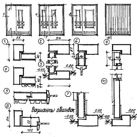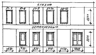 Оконная коробка - это рама, в которую вставляются переплеты. В коробку вводят горизонтальные и вертикальные импосты (при больших проемах). Они бывают раздельные и общие для обоих переплетов. Подоконные доски бывают деревянные и железобетонные (рис. 1,4.). Оконными переплетами - называют остекленные элементы окон: -наружный и внутренний. Двери состоят из открывающихся полотен и дверной коробки однопольные, двупольные и полуторные. По положению в здании: наружные, внутренние и шкафные. Наружные делятся на входные и балконные (рис. 1.). Размеры дверей выбирают в зависимости от необходимой пропускной способности и габаритов мебели и оборудования. Размеры полотен: 600, 700, 800, 900 и 1100 – однопольные; 1200, 1400 и 1800-двупольные; h = 2000 и 2300 мм.