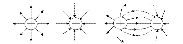 Электричество – совокупность явлений, обусловленных существованием, движением и взаимодействием заряженных тел или частиц. Частицей, обладающей элементарным электрическим зарядом, является электрон. Его заряд e =1, 6·10-19 Кл, масса me = 9,1·10-31 кг. Кроме электронов, носителями зарядов являются также ионы - атомы или молекулы, у которых избыток или недостаток электронов, и другие элементарные частицы. Взаимодействие электрических зарядов происходит по закону Кулона F = где q1 и q2 – заряды; r – расстояние между ними; e – относительная диэлектрическая проницаемость среды, в которой происходит взаимодействие; e0 – называется диэлектрической проницаемостью вакуума. (e0 =8,85 10-12 ф/м). При взаимодействии одноименные заряды отталкиваются, а разноименные – притягиваются. Электрическим полем называется материальная среда, обуславливающая взаимодействие электрических зарядов. Следовательно, поле так же материально, как и вещество. Если поле образуется неподвижными зарядами, то оно называется электростатическим. Количественными характеристиками интенсивности электрических полей являются: напряженность Е, смещение D и потенциал Величина Е называется напряженностью электростатического поля и она есть сила, действующая на пробный заряд g0: Е = Е величина векторная и характеризуется тремя признаками: направлением, численным значением и точкой приложения. Направление совпадает с направлением силы, действующей на положительный заряд. Поля могут быть однородные и неоднородные. Если Е = const для всех точек поля, то оно однородное. Если Е ¹ const для ряда точек поля, то оно неоднородное. При g0 = 1, напряженность поля численно равна силе и по направлению совпадает с силой. Размерность величины [E] = [LMT-3J-1], единицей измерения в системе СИ является Н/Кл или В/м. Для наглядного изображения электростатических полей применяется метод силовых линий, предложенный английским физиком М. Фарадеем. Силовыми линиями (линиями напряженности) называются кривые, касательные к которым в каждой точке совпадают с направлением вектора напряженности поля. Густота силовых линий пропорциональна значению вектора Ē.Силовые линии нигде не пересекаются и нигде не прерываются. Принято считать, что силовые линии начинаются на положительном заряде и заканчиваются на отрицательном или уходят в бесконечность. Простейшие электростатические поля могут быть изображены с помощью силовых линий так:
